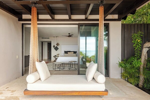 BEDROOM 1Sleeps 2 – King-size bed. En-suite bathroom with freestanding tub, rain head and hand shower and double vanity. Direct access to patio with ocean views.