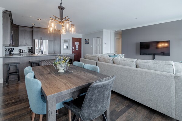 The living room, with its ultra-comfortable sofa and TV, is the perfect place to relax after a busy day.