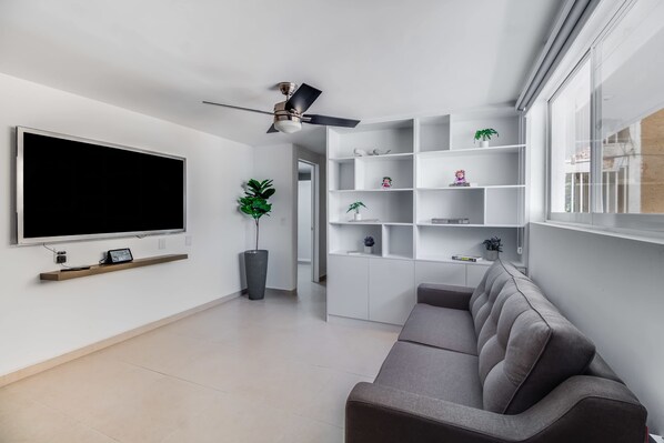 +El departamento cuenta con Sala con sofá cama para una persona y Comedor, con pantalla de 65 pulgadas; cocina integral de concepto abierto, refrigerador, horno de microondas, cafetera, lavasecadora y todos los utensilios necesarios como vajilla, sartenes que te facilitarán tu estadía.