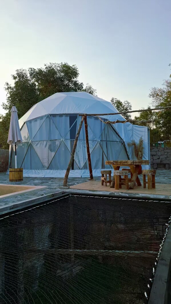El baño completo ofrece agua caliente y privacidad total, mientras que el exterior del domo invita a disfrutar del silencio y el paisaje. La alberca privada, la malla suspendida, el fogatero y la mesa exterior con iluminación tenue crean un entorno perfecto para leer, meditar, compartir una cena tranquila o simplemente contemplar el cielo abierto. Cada detalle del domo está pensado para favorecer el descanso, la serenidad y una conexión más íntima con el entorno.