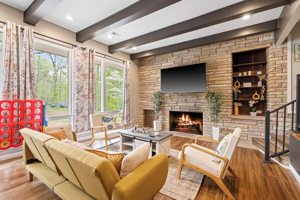 Smart-TV, Kamin, Videospiele, Tischtennisplatte