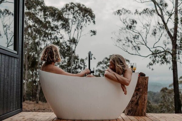 Tiny Kya sleeps up to four with a queen bed in the window and a double bed in the loft. There is also a reverse-cycle air-conditioner and heating unit. Discover a curation of Wandering Folk’s finest picnic essentials, throws and glassware and indulge in freshly roasted coffee, compliments of St Ali. Tiny Kya also features a beautiful deck complete with outdoor bathtub.