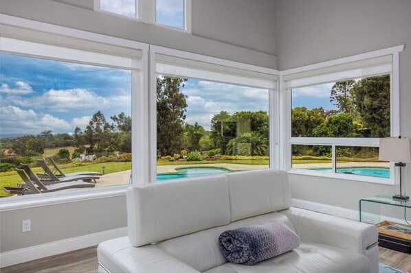 Die Haupt-Master-Suite im Westflügel verfügt über einen Eingang mit doppelter Milchglastür und gewölbten Echtholzbalkendecken, einen 65-Zoll-Fernseher, einen Kamin, eine Glasschiebetür zum Balkon und einen Poolbereich. Eigenes Badezimmer mit Doppelwaschtisch, Dusche und separater Badewanne. Direkt vor der Haupt-Master-Suite im großen Flur befindet sich der Saunaraum, in dem sich das gesamte Haus befindet. Auf diesem Flur befindet sich das dritte und vierte Schlafzimmer. Das dritte Schlafzimmer zur Vorderseite der Unterkunft verfügt über 2 Einzelbetten, die zu einem weiteren Bett zusammengeschoben werden können. Das vierte Schlafzimmer ist als Büro eingerichtet, mit einem Sitz- oder Stehpult, einem Drucker und einem großen Bett in dem weißen Schrank, der ein Schrankbett ist. Der Flur hat auch ein Badezimmer mit Dusche. Der Eintrag hat ein Pulver Bad. Der Hinterhof hat einen atemberaubenden Blick auf San Diego und Rancho Santa Fe. Es gibt einen Whirlpool und einen Pool. Eine Whirlpool- und Poolheizung ist während des Aufenthalts gegen eine zusätzliche Gebühr verfügbar.