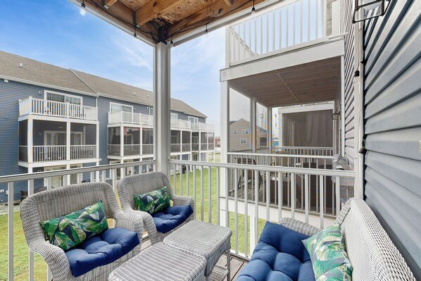 This three-level escape is beach-casual, but with elegant touches, and offers the features and amenities you expect including a modern, WiFi-enabled home with Amazon Alexa music options, and smart, streaming televisions. Up the stairs, you’ll be greeted with an open floor plan, new hardwood floors throughout, and a comfy living room with a gas fireplace (in season). The dining area off the kitchen is perfect for family-style meals and is bracketed by a breakfast nook with four seats for your morning coffee near the airy kitchen windows. Take note of the screened porch on this level – which in the summer offers yet another dining option along with breezy outdoor seating. For our foodie guests, you’ll enjoy the spacious kitchen with every tool and option to create your favorite meals and cocktails. The Primary bedroom boasts another deck to enjoy your morning coffee or an evening drink as the sun sets.