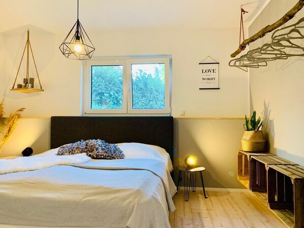 Im Inneren erwartet Sie eine liebevoll ausgestattete Wohnlandschaft, die keine Wünsche offenlässt. Das geräumige Wohnzimmer verfügt über eine bequeme Couchgarnitur, eine praktische Schreibecke und einen 42-Zoll Flatscreen-TV, ausgerüstet mit Astra und Amazon Fire Stick, ideal für entspannte Abende. Die hochwertige Schlafcouch mit einer 22cm dicken Hartschaumatratze verspricht erholsamen Schlaf für bis zu zwei Gäste. Im Schlafzimmer finden Sie ein einladendes Kingsize-Boxspringbett, geeignet für zwei Personen, sowie genügend Platz für ein zusätzliches Kinderbett. Eine Garderobe und drei Kistenschränke bieten umfangreichen Stauraum.