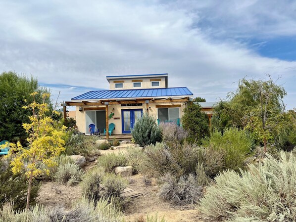 This custom built home features light filled spaces and amazing views of the desert and mountains. A gas stove and heated concrete floors keeps the space warm and cozy. The interior features 1 queen bed and 1 sofa bed with comfortable furniture to relax and reflect. Enjoy coffee on the deck in the morning, and watch the stars come out at night. Bring your animal companions and enjoy the fenced yard and neighborhood rural walks.