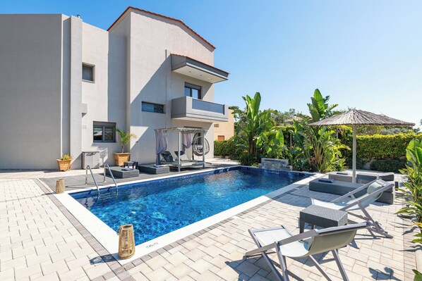 Hideaway Villa is an incredible villa for rent that combines relaxation and comfort in a great location near all kinds of conveniences and places of interest. It offers an incredible private swimming pool and an exceptional view of Rhodess forest trees . Also, the villa is quite close to the cleanest beach on the island ,Ixia beach, in only a 5-minute drive. Hideaway Villa hosts up to 6 guests. This beautiful villa has 3 modern fully air conditioned bedrooms in a serene design. There are 3 bedrooms with double beds. Also, there are 2 stylish full bathrooms, one with a shower and a bathtub.In addition there is a wc on the ground floor. The fully equipped kitchen is beautifully decorated and is accompanied by a dining area. Theres a smart TV - PS4 with lots of games that you can play & free WIFI access throughout the property. In the attic you will find fitness equipment such as a treadmill, weights and a cycle bike indoor, where you can exercise during your vacation while gazing at the incredible view from the window. Outdoors, theres a fantastic private swimming pool with sunbeds where you can relax under the Aegean sun. You can enjoy playing table tennis & foosball table.. The divine location offers a beautiful view of the green forest of Rhodes. This villa has everything you might need to feel comfortable and at home. Theres a BBQ facility where you can prepare all fresh meals and enjoy gathering with your loved ones in the outdoor dining area. This incredible house is set in Ialysos, where you can find in a few steps everything you might need during your stays such as supermarkets, pharmacies, restaurants, and car rentals. Ialysos beach is found in only a 5-minute drive. At Ixia beach, youll have the chance to admire an idyllic sunset and take a romantic walk. Also, visitors should explore the Old Town, a UNESCO World Heritage, a distance of about a 15-minute drive away from the house. Visitors shouldnt miss one of the most attractive destinations of Rhodes, the Valley of the butterflies within a distance of only a 30-minute drive. The villa is about an hours drive away from the south part of the island, Lindos. Lindos Acropolis is the most exquisite archaeological site on Rhodes and has the dreamiest beaches. The airport is located only a 18-minute driving distance. We would like to inform you that the accommodation tax per overnight stay is as follows: