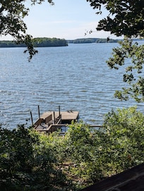 Lakefront retreat with furnished deck, dock, firepit, washer/dryer, & AC