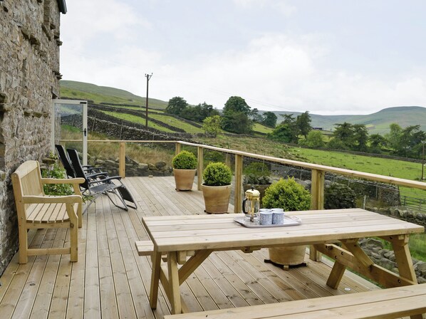 Bathroom: Bath With Shower Over, Heated Towel Rail, Toilet. Oil central heating (underfloor heating on ground floor), electricity, bed linen, towels and Wi-Fi included. Initial logs for multi-fuel burners included. Freezer. . Large enclosed garden with wild flower meadow, summer house, decking, sitting-out area and garden furniture. Bike store. Private parking for 4 cars. No smoking.. Birkend Farmhouse is a beautifully presented detached property standing in an elevated position enjoying spectacular views over Swaledale. This charming holiday home has been furnished and equipped to provide excellent welcoming accommodation, ideal for families, couples or friends, with three bedrooms, one accessed via a separate staircase directly from the dining room. Lovers of the countryside will delight in this truly get away from it all location. Complete with original beamed ceilings, multi-fuel burner and underfloor heating on the ground floor, this property has an excellent blend of traditional features and modern day facilities to ensure a relaxing holiday at any time of the year. There is a summer house in the wild flower meadow garden, patios and a decked area each overlooking the wonderful scenery of this glorious corner of the Yorkshire Dales.