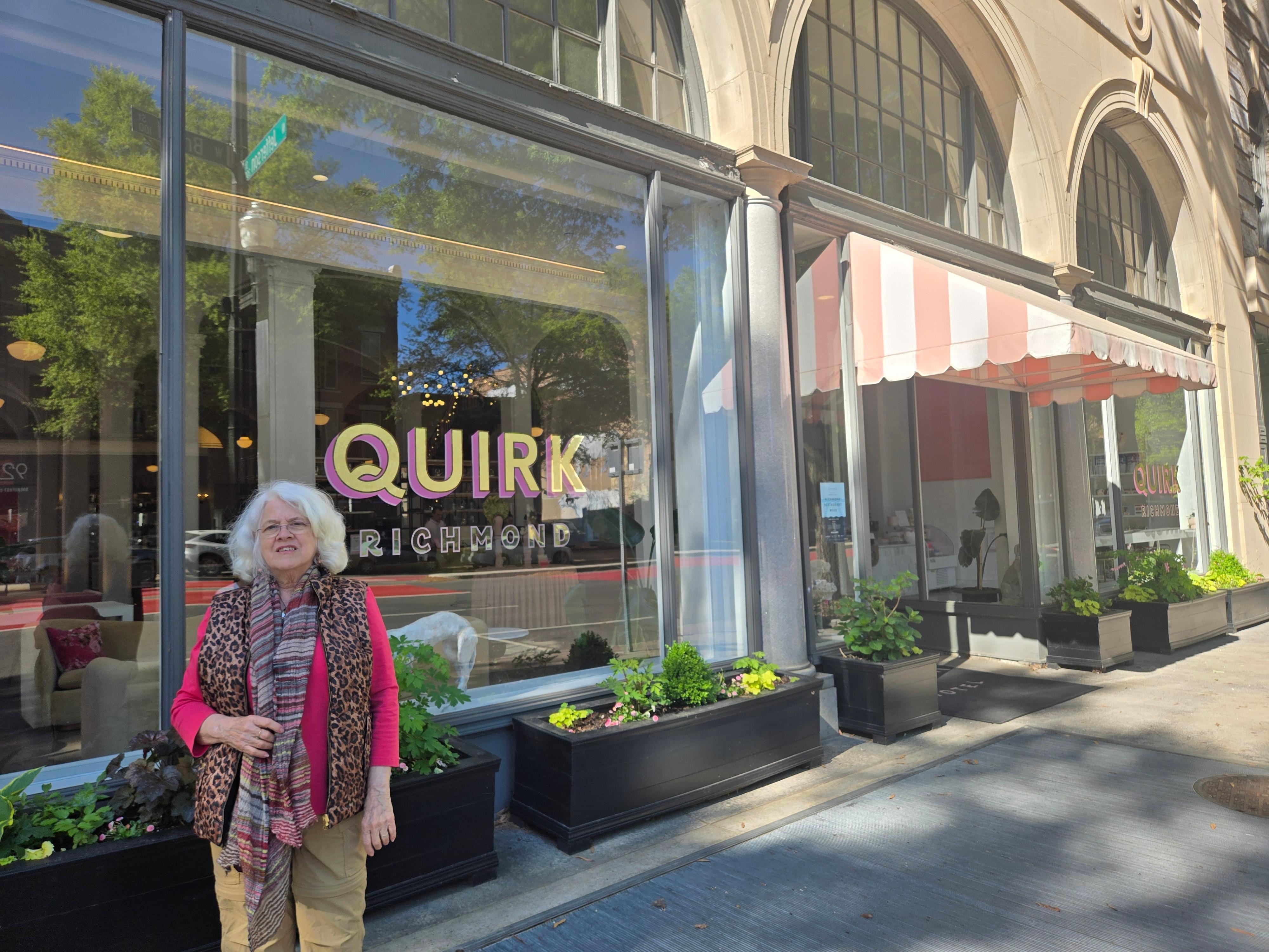 I earlier reviewed this on both Expedia and Trip Advisor, giving a very favorable review about the Quirk atmosphere, the chic decor. It was an experience in pink! But I'd like to say again how much we appreciated the very gracious welcome we got from the lady at the front desk the evening of April 9th. She made us feel like it was our home away from home. She even came to open the front door when we came back in with our bags. Bar staff and breakfast staff were nice too. Also the Gallery had a delightful sping themed exhibit. Fun store.