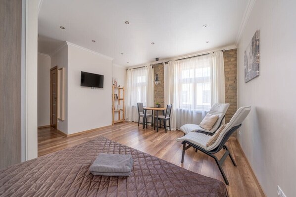 The property is a studio-type apartment with a modern fully equipped kitchen and a king-size high-class bed. The bathroom contains a shower, toilet, sink and washing machine.