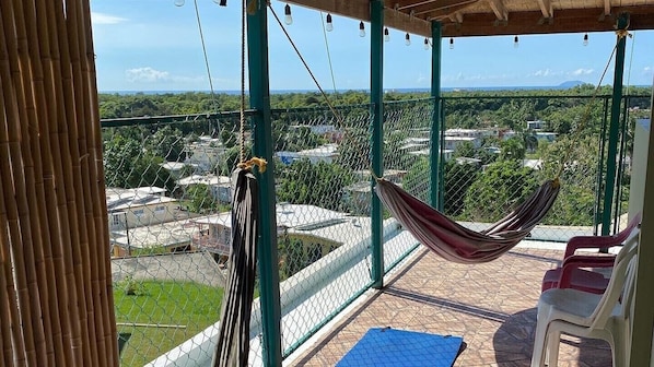There is a nice view overlooking the town to the ocean from the balcony and we saw a beautiful sunset. The hammocks were a hit with my crew.