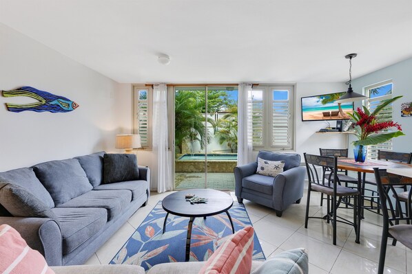 Ours is the most spacious, well stocked, and private of all the Wave Coast units. Our style is modern and minimalist, while being fully equipped with top-of-the-line EVERYTHING. Furnished with comfy couches, local art, and the cool colors of the Caribbean. We have wi-fi, so you can stay connected, (but we suggest you just go off the grid and enjoy!).