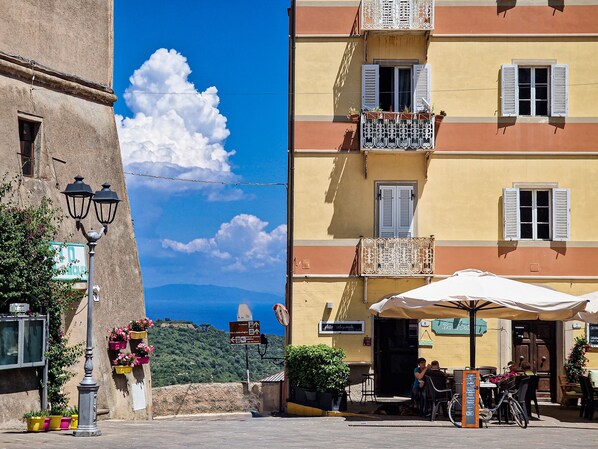 ZU VERMIETEN im Herzen des historischen Zentrums von Rio ELBA, Zwei-Zimmer-Deluxe-Wohnung mit privater Terrasse. Neu renoviert und mit brandneuen Möbeln, die Ferienwohnung mit Blick auf die Dächer des Dorfes geben eine besondere und entspannende Aussicht. Die Terrasse ist privat und nach Südosten ausgerichtet.