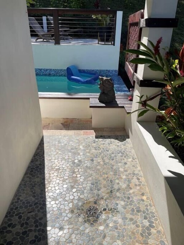 Boasting unique Saltillo tile throughout, the open-air living area invites refreshing breezes, while the plunge pool provides a serene spot to relax and soak in the island ambiance. The kitchen is a chef’s dream, equipped with a premium range and ample counter space, making meal preparation a joy. The custom dining table provides an ideal setting for entertaining, with picturesque views and delightful cross-ventilation.