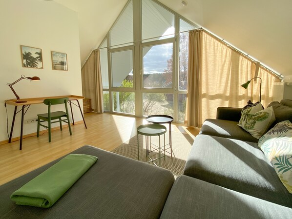 Im Obergeschoss gibt es 2 Schlafzimmer, die jeweils mit einem Doppelbett ausgestattet sind, ein weiteres Duschbad und einen Aufenthalts- und Arbeitsraum. Dieser Raum ist mit einem Schreibtisch und einem Sofa ausgestattet und kann wahlweise zum Arbeiten, Lesen oder Entspannen genutzt werden.