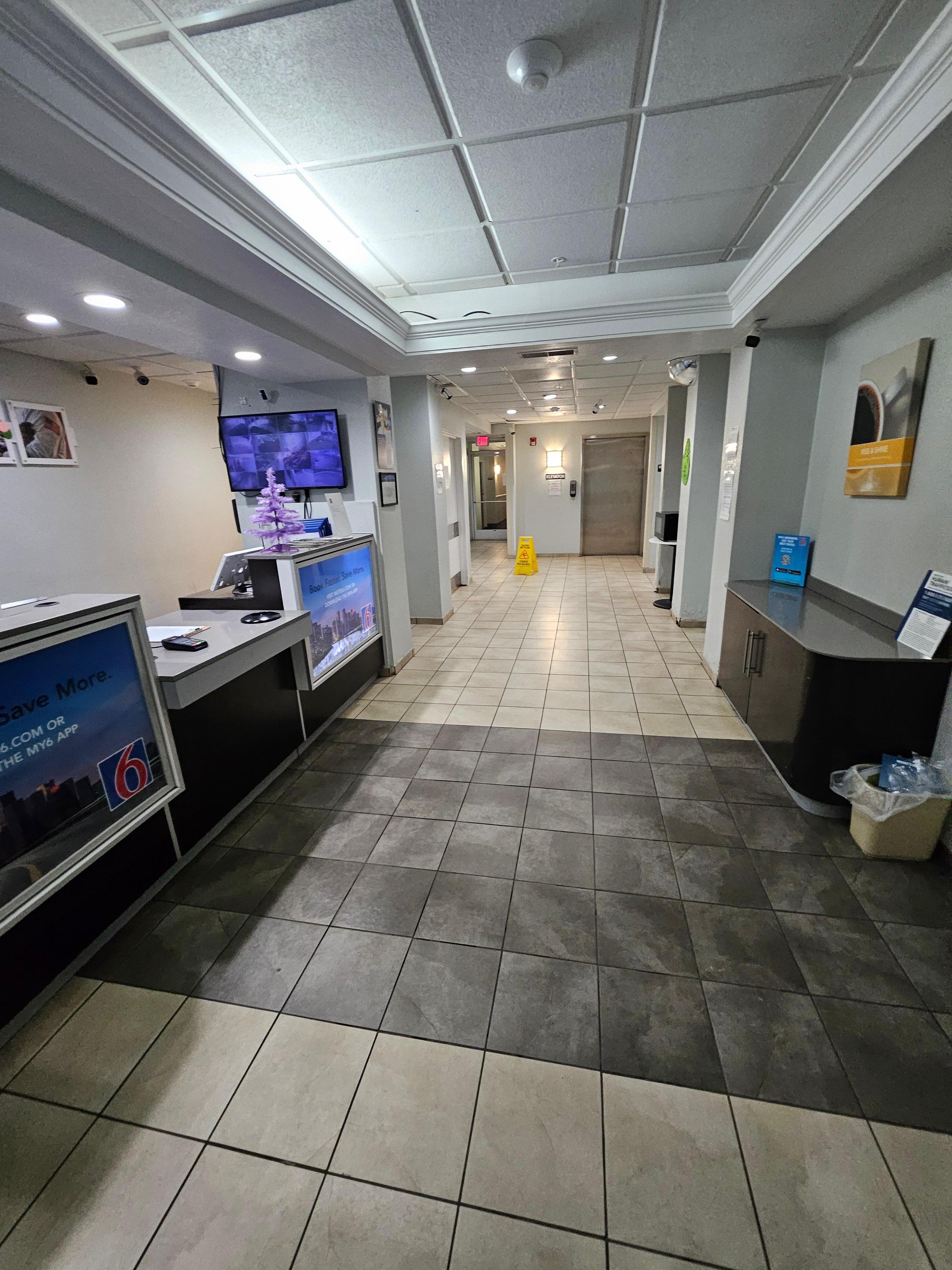 We arrived at 11pm, my husband waited a while to get check in (front desk was probably in the restroom) once we got the room key we went straight to our room in the first floor, the hallway smelled like weed, the carpet was old and dirty, we opened our room door and I stepped in a medium size bug (still in my shoe sole) we walked in and saw several small bugs crawling on the desk, I put one in a small cup and took it to front desk to show the staff about it. The room door was busted (like somebody kicked it and it was half fixed) we felt very unsafe in that place, other guest walk in with big pit-bull dog jumping all around. The front desk lady Mackenzie was an angel she helped us to get our refund.
