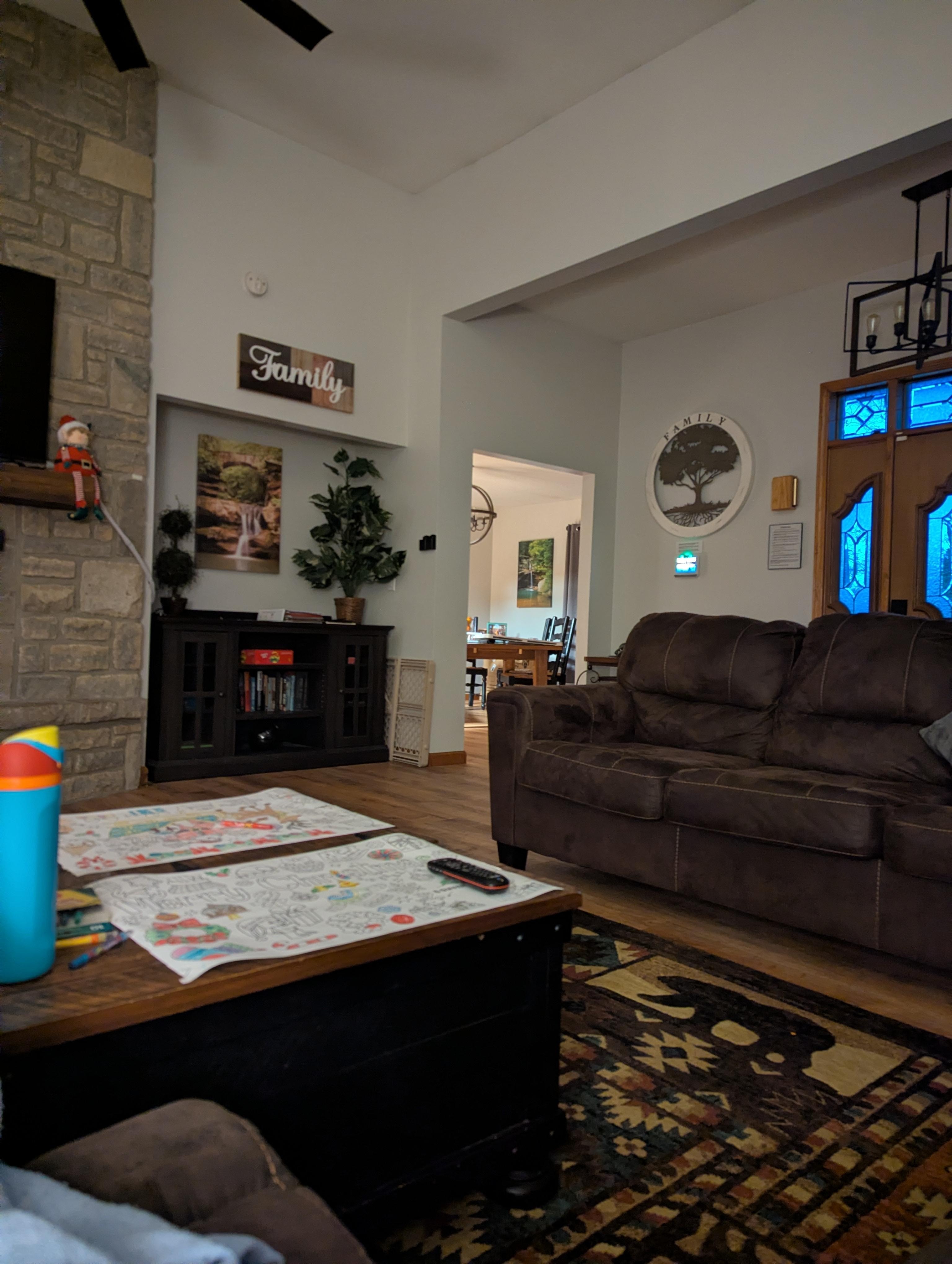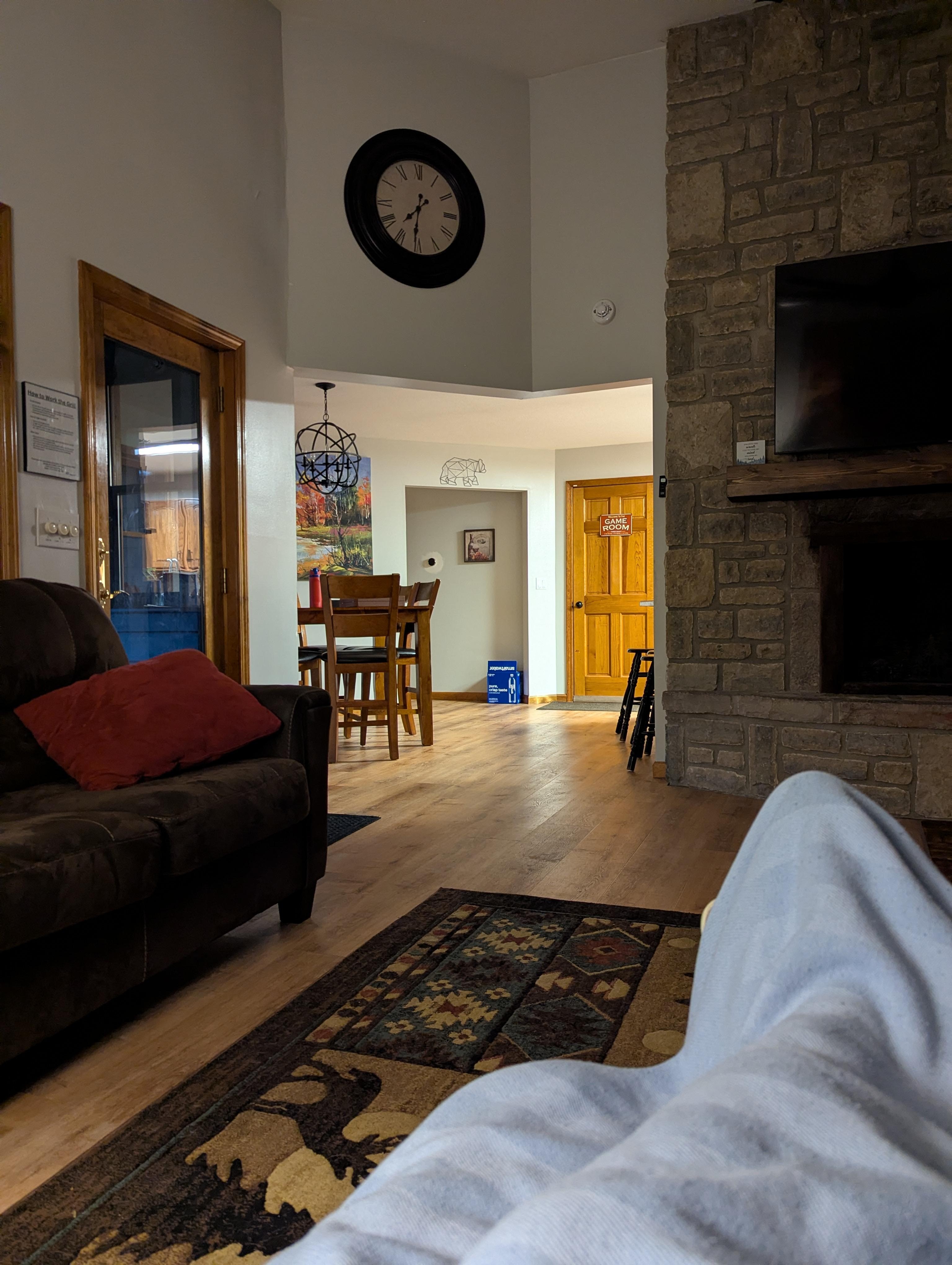 A second great room with brick fireplace and oversized sectional for movies and game night.