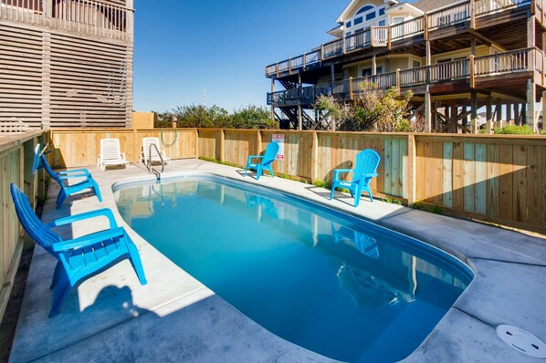 OCEANVIEW Rodanthe - Seehafer Dr. SANDY BRITCHES steckt voller Überraschungen für Ihren nächsten Urlaub. Nehmen Sie ein Bad im privaten Pool oder machen Sie einen Spaziergang zum nur 4 Lose entfernten Strand. Wenn Sie am Strand fertig sind, verstauen Sie Ihre Ausrüstung im großen abschließbaren Aufbewahrungsbereich. Im Innenbereich genießen Sie eine Runde Billard im Spielzimmer am Billardtisch, die auch zum Pokertisch wird. Ein bequemes Vollbad steht für schnelle Ausflüge vom Pool oder Strand zur Verfügung. Die mittlere Ebene beherbergt drei Schlafzimmer, eines ist ein König Meister mit eigenem Bad und Schieberegler Zugang zum überdachten Deck. Die anderen beiden Schlafzimmer (Königin, Pyramidenbett) teilen sich ein Badezimmer. Der luxuriöse Whirlpool befindet sich auf der überdachten Terrasse dieser Ebene. Im Obergeschoss finden Sie ein weiteres Schlafzimmer mit Kingsize-Bett und halb privatem Zugang zu einem Badezimmer, das Sie mit dem großen Zimmer teilen. Die gut ausgestattete Küche bietet eine komfortable Lage für die Zubereitung der Tagesgerichte, die im Essbereich oder auf der möblierten Veranda mit Blick auf das Wasser serviert werden. Genießen Sie den Sonnenaufgang oder -untergang einer Insel von der umlaufenden Terrasse mit Blick auf das Meer und den Klang. Mit Annehmlichkeiten wie diesem möchten Sie jedes Jahr in SANDY BRITCHES sein.