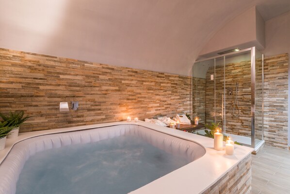 The apartment is located on the ground floor in a quiet building with an independent entrance directly from the street. The apartment is divided into three floors, as soon as you enter the house we find a living room with kitchenette and bathroom. Upstairs we find 2 double bedrooms with another bathroom. Downstairs we find a relaxation area consisting of a lounge with sofas and fireplace and we also find a private spa for the exclusive use of the apartment with a whirlpool tub, infrared sauna, and a shower with rain effect chromotherapy. To complete the property you have smart TV with NETFLIX and PRIME VIDEO (archive with over 1000 films and TV series in different languages), free fiber optic WIFI (very fast), air conditioning, independent heating, fully equipped kitchen, washing machine, kettle, NESPRESSO capsule coffee machine, iron and ironing board, high quality upholstery and furniture.