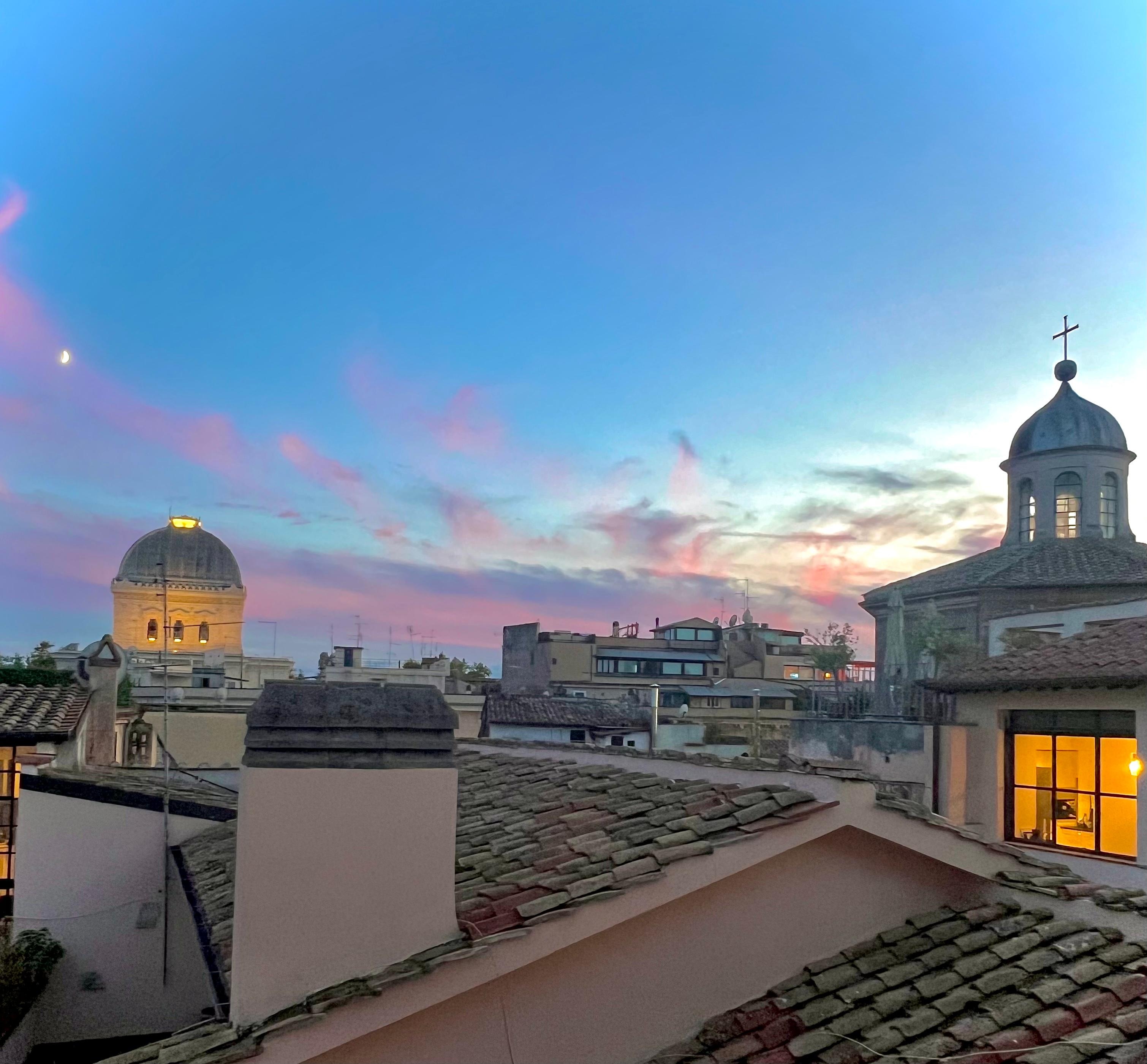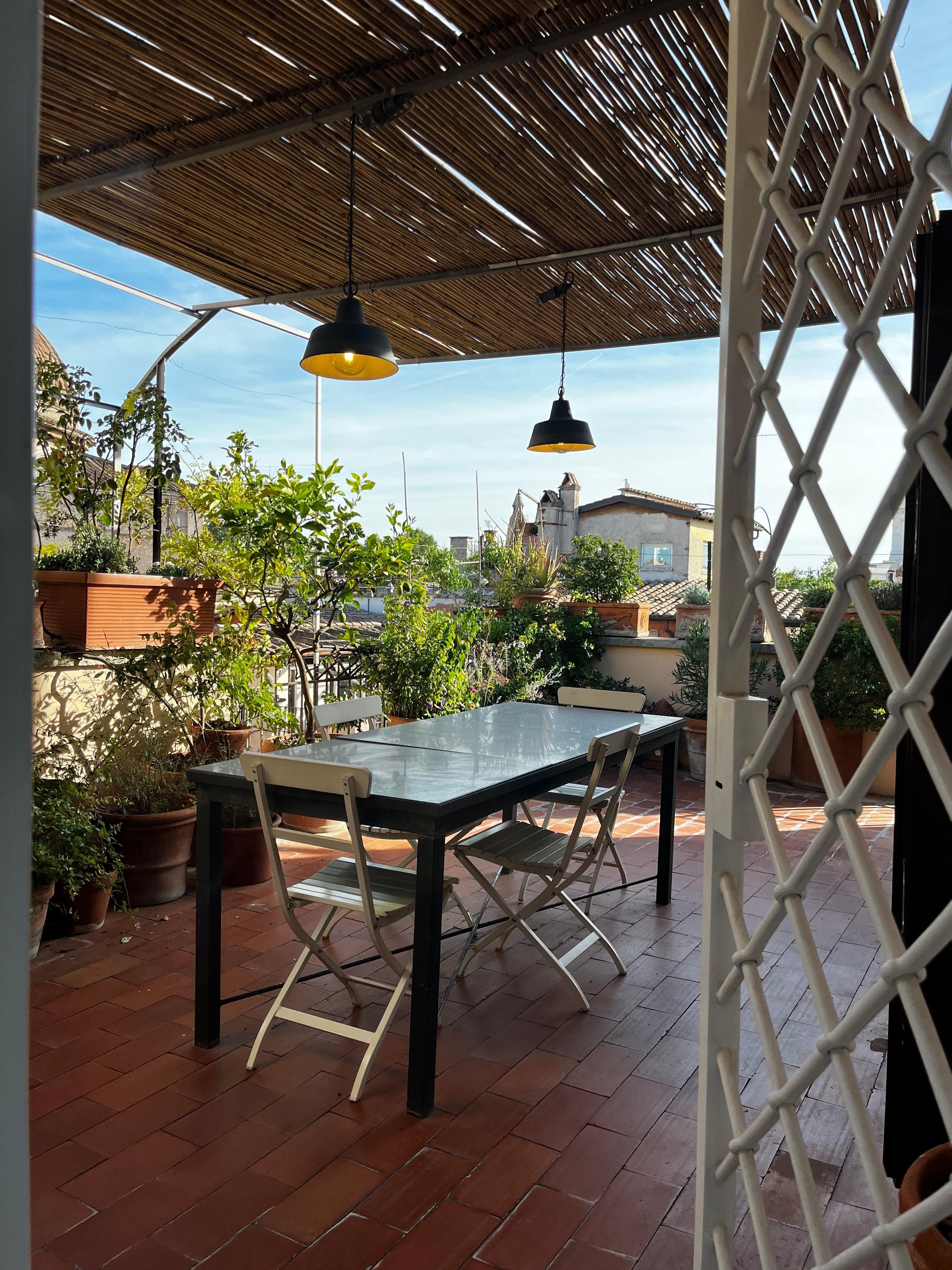 The spacious living room is one of the main highlights, offering direct access to a panoramic terrace. The terrace is furnished with a table and chairs, making it perfect for outdoor dining, relaxing, or enjoying the breathtaking views of Rome’s rooftops and landmarks.