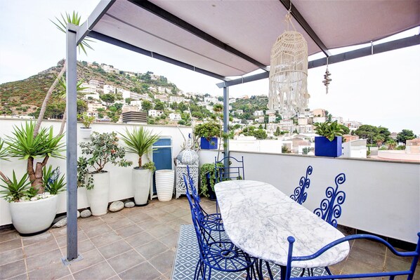 Terrasse / solarium idéal pour les digestifs entre adultes et fins de soirées au calme et au frais. Très chaud dans l'appartement, mais les gros ventilateurs sont efficaces. Fond de cuisine fourni : il y a tout le nécessaire.