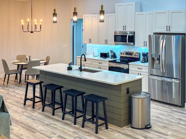 • Amenities: Dish soap, dishwasher soap, paper towels, and napkins provided.