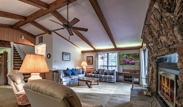 'Hirschbesuch täglich' in der Mule Deer Lodge. Bleiben Sie und genießen Sie die Tierwelt, während Sie mit der Familie in den zwei geräumigen Wohnzimmern mit Kamin neue Erinnerungen schaffen. In der großen Küche, die sich zum Wohnzimmer und zum Esszimmer öffnet, können Sie Ihre Mahlzeiten leicht zubereiten. Entertain auf dem Wrap-around-Deck mit Whirlpool. Wachen Sie unbedingt mit einer warmen Tasse Kaffee oder Tee vor dem Kamin auf. Für größere Gruppenunterkünfte befindet sich die Mule Deer Lodge neben dem At Wit's End und der Indianhead Lodge. BJs Blockhütte liegt vier Häuser weiter auf der anderen Straßenseite und Little Jacks und Moon Mountain Lodge sind einen Block entfernt. Zuhause ist ungefähr 3100sq ft.