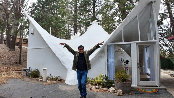 Discover the magic of Winter Wonderland inside this Hyperbolic Paraboloid home featured on HGTV Ugliest House in America Season 7 Episode 5. The beauty of this design is in the distinctive geometry. In geometry, hyperbolic paraboloid has a quad axis. One axis curves to an upward parabola creating the winglike roof design, while the other axis curves into a downward parabola creating the saddle roof design. Unlike traditional homes that rely on mass for strength, this house gets its strength from its shape. This vacation home has a convenient level parking. Located on CA-18 which is 7 miles to Lake Arrowhead Village; 5 miles to SkyPark Santa's Village; 20 miles to Big Bear. Amenities includes: King bed; Full sofa bed, Wi-Fi, 65" TV, coffee / tea / cocoa/ oatmeal/ S’mores / Ramen / breakfast bar, and much more. Pet fee $100 per pet per day.