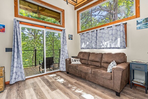 Roxy Ridge is a very unique luxurious cabin development that boast incredible National Forest and Lake views within walking distance to Horsehead Lake Lodge and Event Center. Roxy Ridge is the second cabin within the development that contains a full kitchen that overlooks the open living room and balcony. The unit has one bedroom, sleeper sofa, and bathroom including a washer and dryer. The balcony will take your breath of the surrounding nature and the tree-top feel of it all. There is also a gazebo with 360 degree views, screened windows, furnished with a fire pit table, couch and 2 chairs to provide a unique experience even in inclement weather. Want a real fire pit. No problem. It is located in the private courtyard next to the cabin and also includes a gas grill with outdoor seating and picnic table. The cabin comes complete with all furnishings including a fully stocked kitchen, luxurious bath and bed linens. Bring your ATV's, UTV's, boats, kayaks,, and dogs! We have kayaks, canoes and peddle boats available for guests to use at 2 private docks, one has a walking trail and the other has vehicle access. Or bring your hammock and simply enjoy relaxing in nature. Whatever your preference we are certain you will enjoy your stay!