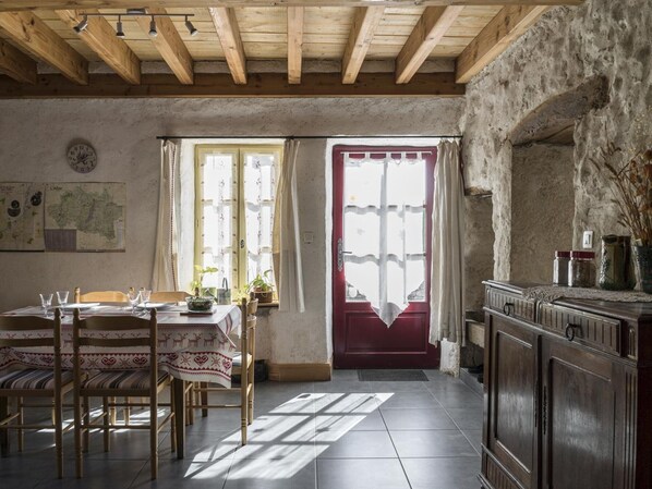 Erdgeschoss: Der Essbereich und die offene Küche führen auf eine Terrasse und in einen 400 m² großen, umzäunten Garten mit Blick auf die Wiesen. Das Wohnzimmer ist mit einem Pelletofen ausgestattet, einem charmanten Dekorationselement. Es gibt ein Schlafzimmer mit Doppelbett, ein Schlafzimmer mit drei Einzelbetten, eine ebenerdige Dusche und ein separates WC. WLAN ist verfügbar.