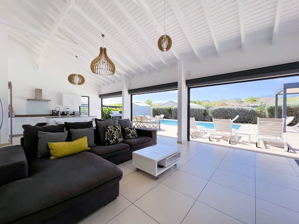 The large living room, open to the outside, includes a lounge and an American kitchen with pantry.The 4 air·conditioned rooms of Villa Pointe Bleue are havens of peace, perfect for resting after a busy day, offering privacy and comfort to all its guests.