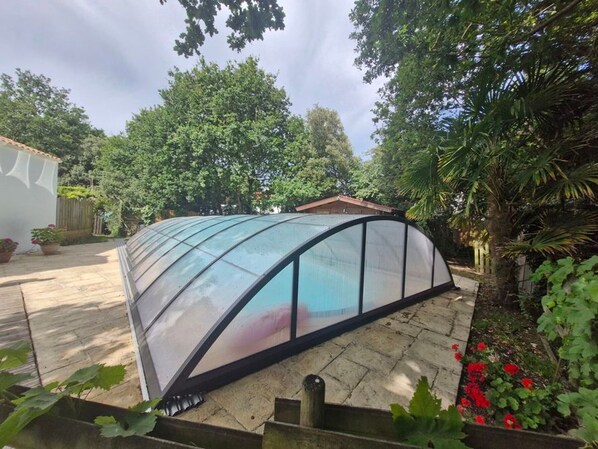 Auf einem bewaldeten Grundstück von 2054 m², in ruhiger Lage, Haus mit beheiztem Schwimmbad (gesichert durch eine Barriere und eine Schwimmbadüberdachung – Schwimmbadroboter) im Orouet-Sektor – ca. 3 km vom Strand und Geschäften entfernt – Bäckerei in der Nähe - WIFI-ZUGANG -- - EINGANGSHALLE: möbliert -- - SEPARATES WC