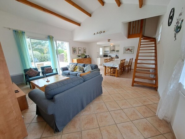 - Wohnzimmer mit 2 Sofas und 2 Sesseln und einem großen Esstisch, 1 Flachbild-TV und WIFI, ideal für angenehme Abende.