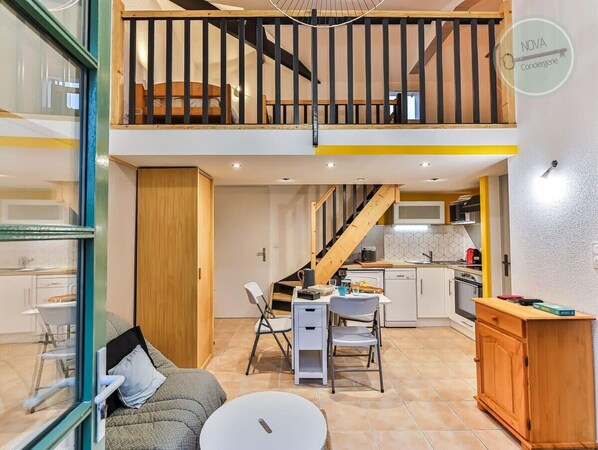 Das renovierte 44 m² große Haus verfügt über ein Schlafzimmer mit Doppelbett und Fernseher, eine Wohnküche mit Kochnische, Bad und separatem WC sowie ein Zwischengeschoss, das Platz für drei Personen bietet (2 Einzelbetten und 1 Ausziehbett). Auf der Außenterrasse können Sie Ihre Sommermahlzeiten genießen oder sich sonnen.