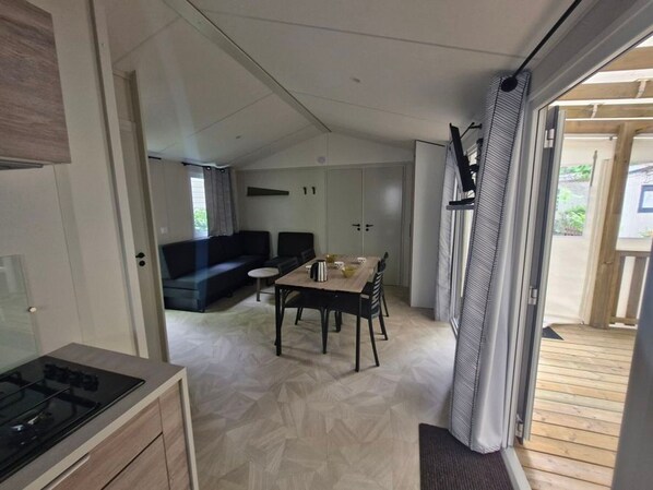 Auf einem 4-Sterne-Campingplatz, 1800 m vom Strand entfernt und in unmittelbarer Nähe von Wald und Radwegen, befindet sich ein Mobilheim (Baujahr 2025) für 4 Personen mit einer Wohnfläche von 31 m². Der Campingplatz bietet einen Lebensmittelladen, ein Restaurant, eine Bar, Imbiss, einen Fitnessraum, einen beheizten Außenpool (Juli/August), einen beheizten Innenpool und einen Whirlpool. Internet, Fahrradverleih, Sauna, Hamam und Waschmaschine sind gegen Gebühr verfügbar.