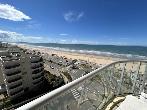 Diese Ferienwohnung im 7. Stock (mit Aufzug erreichbar) bietet einen Balkon mit Meerblick. Sie besteht aus einem Wohnzimmer mit Doppelschlafsofa und Fernseher, einer voll ausgestatteten Küche (Kühlschrank mit Gefrierfach, Elektroherd, Mikrowelle und Gasherd), einem Schlafzimmer mit Doppelbett (140 cm) und Etagenbett (90 cm) mit Meerblick, einem Badezimmer und einem separaten WC.