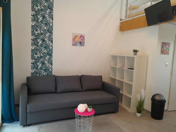 Lake on foot! Bright studio+mezzanine, TV, WIFI, terrace, parking, near village