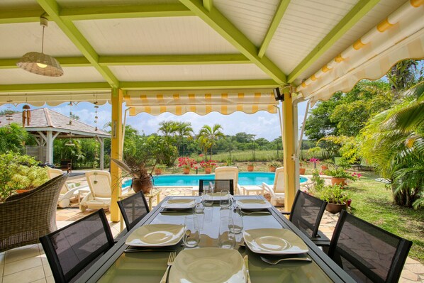 Sie werden sicherlich die schattige Terrasse zu schätzen wissen, die mit einer Lounge im Freien und einem Essbereich ausgestattet ist. Es blickt auf den Garten und den großen Pool mit Liegestühlen.