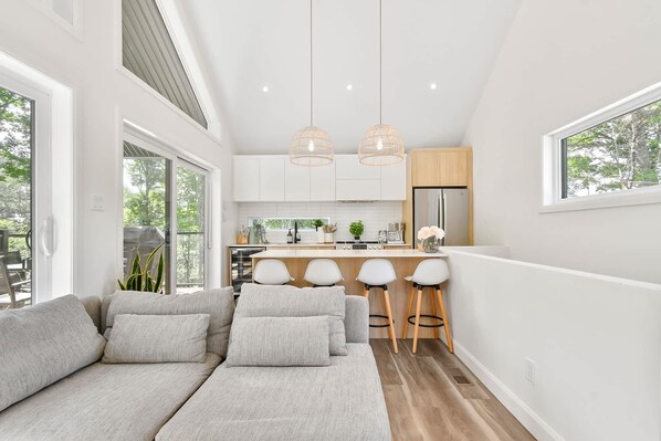 After a walk along the private trails of the estate, nothing beats a break in the private sauna with views of nature. When evening falls, you light the wood-burning fireplace inside for a cozy atmosphere, or prefer the campfire outside under the Milky Way. You share a convivial meal thanks to the fully equipped chef’s kitchen (BBQ, wine cellar, all the accessories you need, plus coffee and condiments provided) and savor the moment either in the outdoor dining area or in the hammock, gently rocked by the forest.