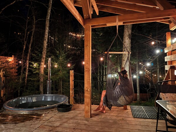The wood-fired spa is open year-round for an exceptional experience! The private Nordic bath is a two-step process: heating the bath water over a wood fire to the sound of the river in the middle of nature. If you can't build a fire, you may not be able to take full advantage of our facilities! Since this step takes several hours in winter, it's possible that you won't be able to enjoy a hot Nordic bath until the second day of your stay, but it's worth the wait - it's magical! The smell of burning wood, the cedar of the Nordic bath, the river, nature... it's perfect! However, we can't guarantee an optimal temperature during the coldest weather, so you may not be able to enjoy it if the temperature isn't mild. Above -20C, there's a good chance you won't be able to take advantage of it. Please allow around 5 to 6 hours of heating on the first day. After that, the temperature will be reached more quickly for the rest of your stay! During the summer, if an outdoor fire ban were in place in the Saguenay due to the risk of forest fires, the Nordic bath could not be used, but in this heat, a swim in the river will be even more appreciated!