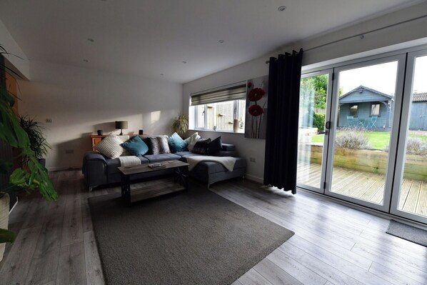 - Lounge: Double sofa bed, large TV, and corner sofa
