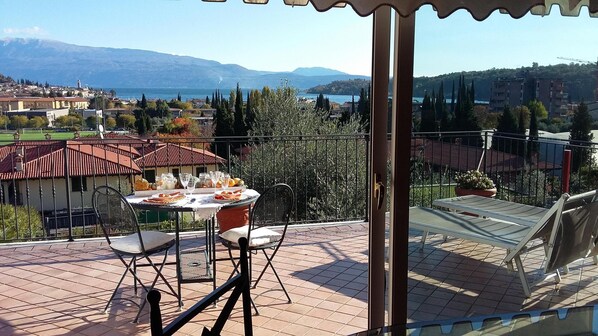 Die Wohnung verfügt über ein zusätzlich gefliestes Solarium mit Seeblick. Dieses Solarium ist von Kräutern (Rosmarin, Salbei, Minze, Oregano) begrenzt und verfügt über einen Sonnenschirm und einen Strandkorb. Hier können Sie entspannt ein Buch lesen, einen guten Spritz trinken und die Natur genießen.