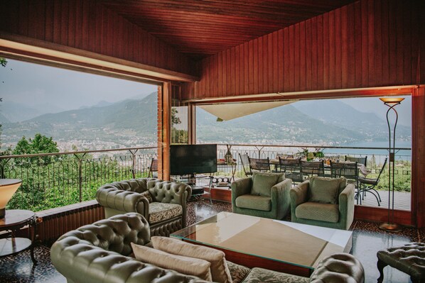 - Ess-/Lounge-Innenbereich: Großer Ess- und Loungebereich, umgeben von Panoramafenstern. Der Essbereich bietet Platz für bis zu 10 Personen, Chesterfield-Sofas und Sessel für 7-8 Personen. Die Decken sind hoch und mit freiliegenden edlen Holzvertäfelungen, einem antiken Klavier und wertvollen zeitgenössischen Gegenständen versehen.
