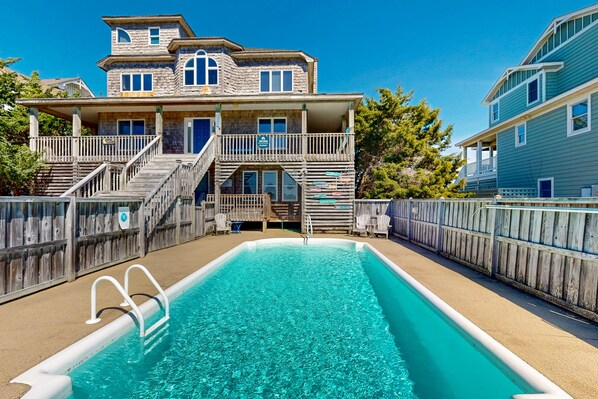 A palace indeed! Views don't get any better than the 180-degree oceanfront vistas you'll enjoy from this Outer Banks vacation home. Catch the sunrise or stroll the beach by moonlight with the Atlantic Ocean steps away. Take the family to the vast, world-class beach with its gentle slopes into the water for swimming and beautiful vistas for days spent fishing and kiting. You can also wade into the large private pool on a whim or read a book poolside.