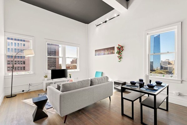 Featuring an open floor plan, this space is an ideal haven for relaxation during your stay with us. Immerse yourself in your favorite entertainment on the Amazon TV while appreciating the contemporary decor that enhances the modern ambiance.