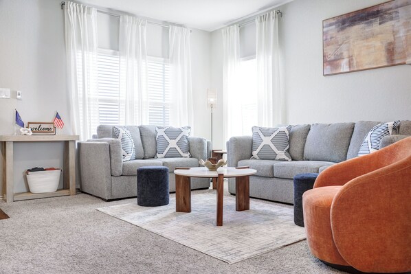 The living room is furnished with a 65” UHD 4K Smart TV, comfortable sofas and ottomans to put your feet up.