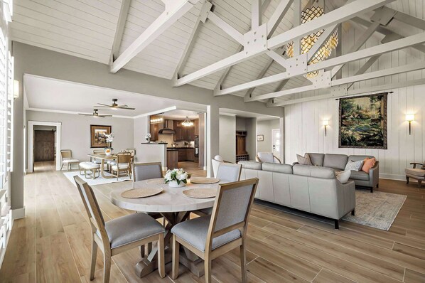 The Main House offers over 5,000 sq. ft. of refined living space, featuring five generously sized bedrooms and five full bathrooms. With multiple living areas and soaring ceilings, the home blends comfort, functionality, and sophistication. The gourmet kitchen boasts modern appliances and custom cabinetry, making it ideal for preparing meals for family and friends. Accommodations include two primary suites, each with a king bed, two additional bedrooms with king beds, a trundle room with two trundles (each featuring a queen on top and a twin on the bottom), and a loft with a sleeper sofa. The main home accommodates up to 16 guests.
