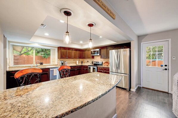 Welcome to our home in San Antonio! This spacious 5 bdrm home is perfect for families, military graduations, or group getaways. Comfortably sleeps groups with a king size bed, 3 queens and 4 bunk beds. Pet friendly,up to 2 pets. Enjoy a fully equipped kitchen, cozy decorative fireplace and an evening lit backyard oasis, with patio seating, hammocks, grill and games. Our home features the ideal blend of comfort and convenience for a memorable stay. Free parking and keyless entry. Conveniently located on a quiet street, 10 minutes to an In-N-Out Burger, great restaurants and HEB grocery market. 20 minutes from Lackland AFB and JBSA, SeaWorld, River Walk and shopping. 30 minutes to Six Flags. For longer stays we are about an hour away from Austin or the wineries in Fredericksburg. Less than an hour you can take a trip to the scenic Guadalupe River which offers padding, trout fishing and tubing.
