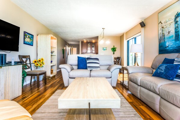 Step into a cool and airy living space that extends the beauty of the ocean panorama. The living area is generously sized, offering comfortable seating and a welcoming atmosphere. Floor-to-ceiling windows flood the room with natural light, creating a seamless connection between the indoors and the breathtaking outdoors.